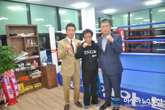 | 20일 오후 8시 인천 남동구 구월1동 아시아드선수촌아파트내 드림프라자 5층 "남동진아복싱체육관" 개관식개관식에 참석한 박남춘 의원(오른쪽)이 안진아 관장(왼족)과 기념촬영을 하고 있다./아시아뉴스통신=김태일, 이명기 기자 |
