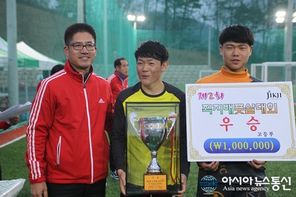 | 22일 충북 청주시 청주풋볼센터에서 아시아뉴스통신충북본부 주최 제2회 직지배풋살대회가 막을 내린 가운데 고등부에서 우승을 차지한 어울림(경북) 팀이 트로피와 상금을 받고 있다./아시아뉴스통신=김지수 기자 |