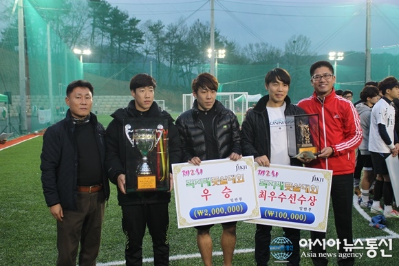 | 22일 충북 청주시 청주풋볼센터에서 아시아뉴스통신충북본부(본부장 김경선. 맨 왼쪽) 주최 제2회 직지배풋살대회가 막을 내린 가운데 일반부에서 우승을 차지한 대전울프풋살클럽이 트로피와 상금을 받고 있다./아시아뉴스통신=김지수 기자 |