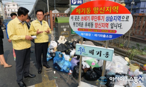 | 지난달 유덕열 동대문구청장이 제기동에 설치된 망신표지판 설치 현장을 둘러보고있다.(사진제공=동대문구청) |