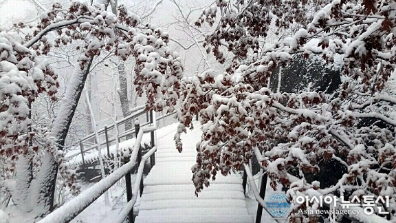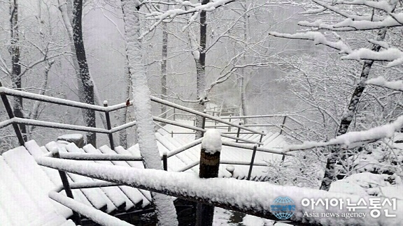 | 25일 충북 보은 속리산 일대에 첫눈이 내려 등산로 곳곳에 눈이 쌓여 있다.(사진제공=속리산국립공원사무소) |