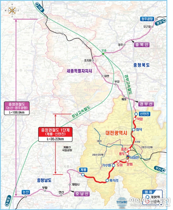 충청권광역철도 1단계 사업은 국가철도망구축계획에 반영된 논산~대전~청주공항(106.9㎞) 노선 중에서 수요가 많은 계룡~신탄진 구간(35.2㎞)을 먼저 추진하는 사업이다. 총사업비 2107억 원을 투입, 내년 기본계획에 들어가 오는 2021년 완공을 목표로 하고 있다.