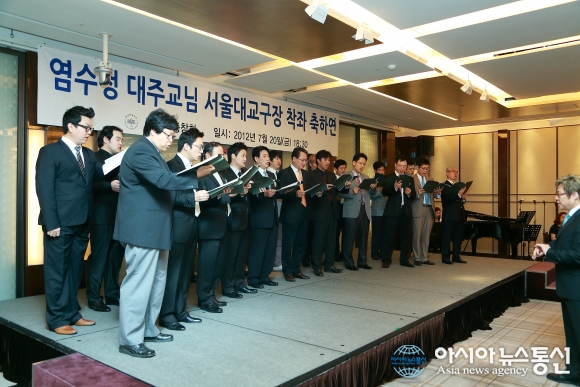 | 지난 2012년에 있었던 염수정 대주교 착좌식에서 축하공연을 선보이고 있는 동성 TEEN OB 남성합창단원들과 김재우 지휘자의 모습이다. /아시아뉴스통신=배준철 기자 |