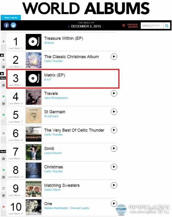 B.A.P의 네 번째 미니앨범 ‘MATRIX(매트릭스)’가 미국 빌보드 월드앨범차트에서 3위를 차지했다.
