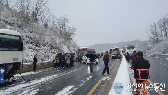 | 26일 오전 9시 6분쯤 충남 공주시 의당면 정안 IC에서 세종방향 15㎞ 지점에서 광광버스와 승용차 등 11대 차량이 눈길로 인해 추돌하는 사고가 발생했다.(사진제공= 공주소방서) |