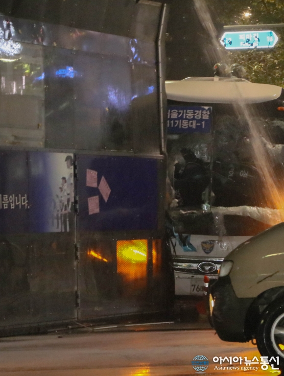 | 지난 14일 민중촐궐기 집회에서 흥분한 일부 참가자에 의해 경찰 버스 밑에 화재가 발생한 모습./아시아뉴스통신DB |