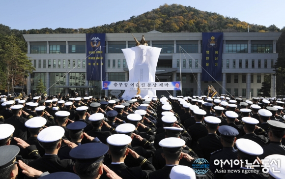 | 27일 오전 해군은 충무공탄신 470주년과 해군 창설 70주년을 맞아 창원시 진해 해군사관학교 충무광장에서 ‘충무공 이순신 동상 제막식’이 거행되고 있다.(사진제공=해군사관학교) |