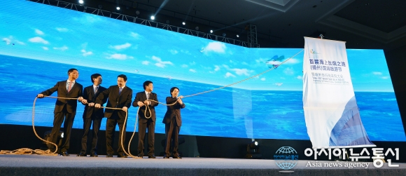 | 웨이홍타오(魏洪涛) 중국국가여유국 부국장(오른쪽 두번째)를 비롯한 내빈들이 '제1회 해상실크로드관광축제' 개막을 알리는 퍼포먼스를 진행하고 있다./아시아뉴스통신=유지현 기자 |
