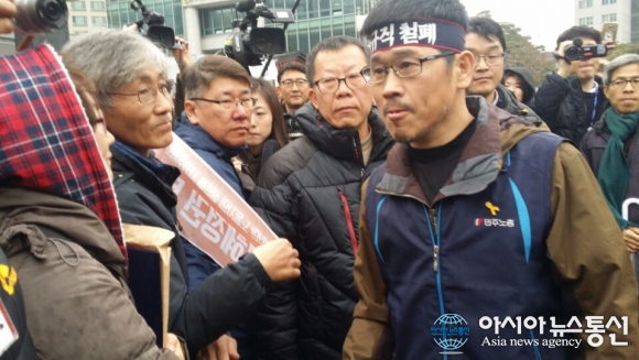 | 민주노총 한상균 위원장이 기자회견 후 조계사에서 퇴거 중인 모습./아시아뉴스통신=전규열 기자 |
