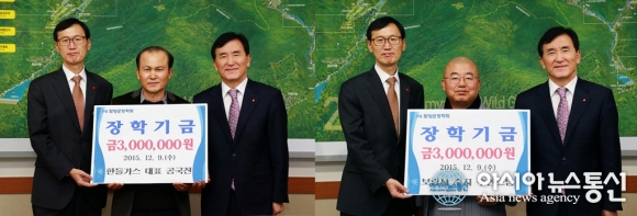 | 9일 경남 함양군 한들가스 공국진 대표와 보림사 주지 수인스님이 함양인재양성에 써달라며 임창호 군수에게 장학금을 전달하고 있다.(사진제공=함양군청) |