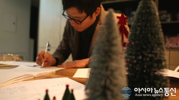 | 직접 카드 그림을 그리고 있는 배우 유준상 월드비전 홍보대사.(사진제공=월드비전) |