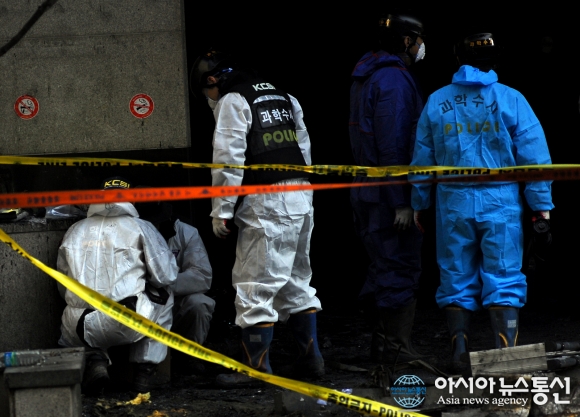 | 12일 오후 1시28분쯤 경찰 과학수사대가 경기도 성남시 분당구 수내동 소재 서영빌딩 화재 현장에서 현장을 감식하고 있다./아시아뉴스통신=정종일 기자 |