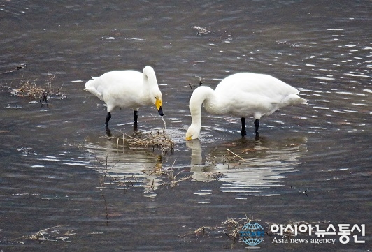| 지난달 28일 충북 보은 속리산국립공원 내 삼가저수지에 날아와 먹이활동 중인 큰고니.(사진제공=속리산국립공원사무소) |