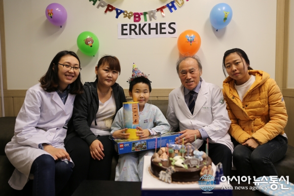 | 지난 12일 나사렛국제병원 이강일 원장(왼쪽에서 네번째)을 비롯한 병원관계자와 환자가족이 나눔의료사업을 통해 치료를 받고 있는 몽골 어린이 에르헤스(왼쪽에서 세번째) 생일파티를 열어주고 기념촬영을 하고 있다.(사진제공=나사렛국제병원) |