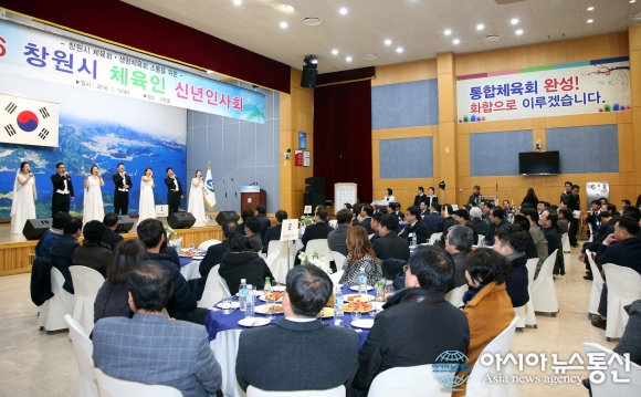 창원시가 주최하고 창원시체육회와 창원시생활체육회가 공동으로 주관한 ‘2016 창원시체육인 신년인사회’가 12일 창원시청 시민홀에서 열려, 체육인의 화합과 통합체육회 발족을 위한 첫걸음을 내딛었다.