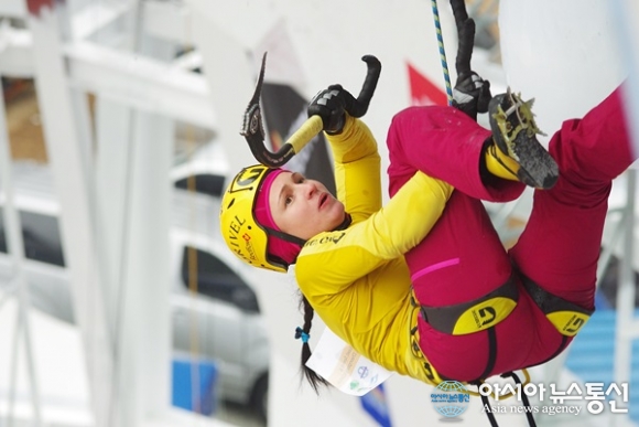 | 경북 청송군에서 16~17일 이틀간 열린 '2016청송 아이스클라이밍 월드컵' 대회에서 여자난이도 1위를 차지한 똘로꼬니나 마리아(러시아)의 경기 모습.(사진제공=청송군청) |