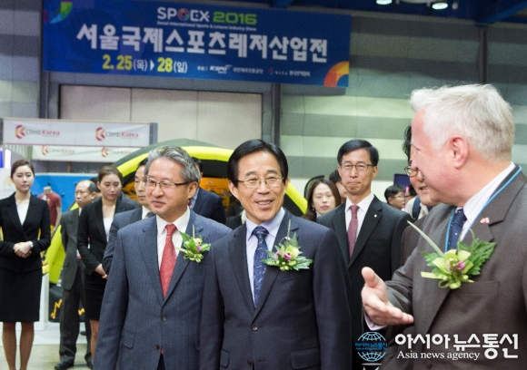 | 국민체육진흥공단 이창섭 이사장(앞줄 가운데)이 스포엑스2016 행사를 관람하고 있다.(사진제공=국민체육진흥공단) |