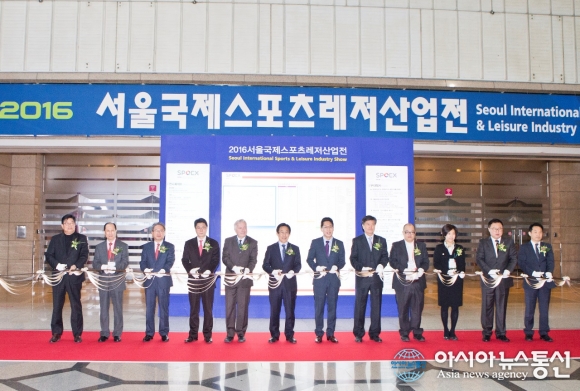 | 2016 서울국제스포츠레저산업전 개막식에서 행사 참여 인사들이 커팅식을 하고 있다.(사진제공=국민체육진흥공단) |