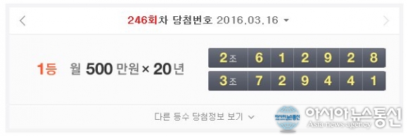 한편 연금복권 246회 당첨번호는 2조 612928, 3조 729441로 발표됐다.