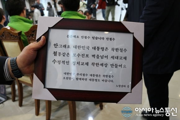 | 17일 열린 국민의당 세종시당 창당대회에서 박휘서 전 연기군의원이 안철수 대표에게 전달한 3행시 액자./아시아뉴스통신=홍근진 기자 |