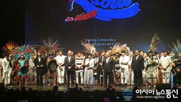 | 지난 3일 멕시코시티 중심가 메트로폴리탄 극장에서 열린 K-SOUL 행사에서 박근혜 대통령이 출연진과 함께 관객에게 인사하고 있다.(사진제공=국제청소년연합) |