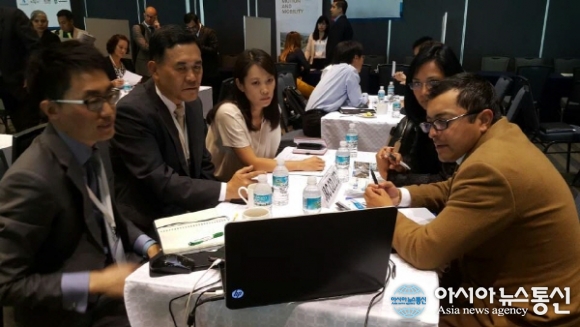 | 4일 진행된 한-멕시코 비즈니스 파트너십 행사에 투입된 굿뉴스코 동문 김지연 씨가 1:1 비즈니스 상담에서 통역을 하고 있다.(사진제공=국제청소년연합) |