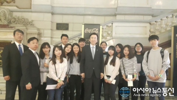 | 윤병세 외교부 장관이 굿뉴스코 단원들을 격려하고 함께 기념촬영을 하고 있다.(사진제공=국제청소년연합) |