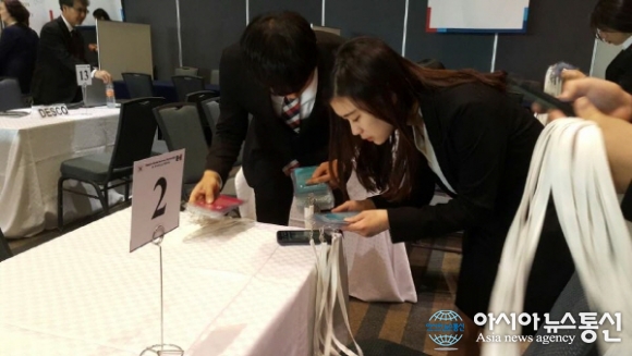 | 굿뉴스코 멕시코 15기 단원들이 4일 진행된 한-멕시코 비즈니스 파트너십 행사에 투입돼 자리배치와 명찰분류 등의 작업을 하고 있다.(사진제공=국제청소년연합) |