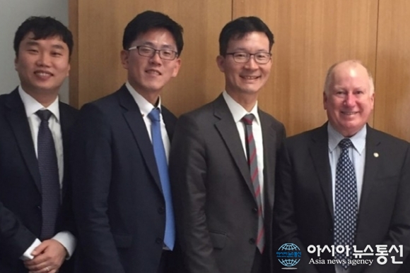 | 세종시 공무원들이 호주의 행정수도 캔버라를 방문, 양 도시 현안과 우호협력에 대한 의견을 나누고 기념촬영을 하고 있다. 왼쪽부터 세종시 정책기획관실 이재강 주무관, 행정도시지원과 권오수 사무관, 조수창 균형발전국장, 호주 수도지역자치정부의 믹 젠틀맨(Mick Gentleman) 장관.(사진제공=세종시청) |