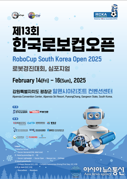 (사진제공=강원관광재단) [아시아뉴스통신=김종학 기자] 강원관광재단(대표이사 최성현)은 제13회 한국 로보컵 오픈(RoboCup South Korea Open 2025, RCKO 2025)이 2월 15일(토) 평창 알펜시아 리조트에서 개막한다고 밝혔다. 한국로보컵협회와 로봇신문이 주최하고 평창군, 강원관광재단, 산업통상자원부, 한국로봇산업진.. 2025-02-12