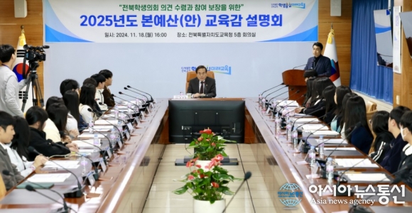 2025년도 본예산 편성 설명회./사진제공=전북특별자치도교육청 [아시아뉴스통신=이미내 기자] 전북특별자치도교육청(교육감 서거석)은 18일 도교육청 5층 회의실에서 전북학생의원 20명이 참석한 가운데 ‘2025년도 본예산 편성 설명회’를 개최한다. 이날 설명회는 전북학생을 대표하는 학생의원들에게 전.. 2024-11-19