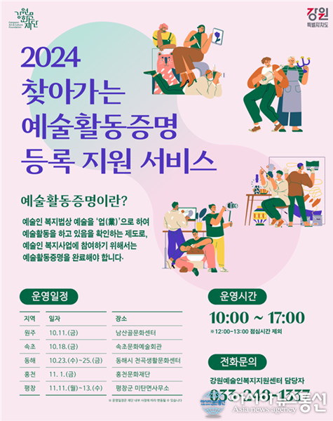 (사진제공=강원문화재단) [아시아뉴스통신=이상진 기자] 강원문화재단 예술인복지원센터가 도내 예술인들의 복지 향상을 위한 적극적인 행보에 나섰다. 재단은 10월 11일부터 ‘하반기 찾아가는 예술활동증명 등록지원 서비스’를 시행한다고 8일 밝혔다. 이번 서비스는 원로예술인과 정보통신기술(IT) .. 2024-10-08