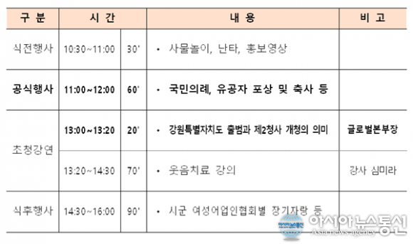(자료제공=강원도청) [아시아뉴스통신=이상진 기자] (사)강원특별자치도 여성어업인 연합회(회장 김영화)가 광역지방자치단체로서는 전국 최초로 ‘여성어업인 한마음 대회’를 개최한다. 이번 대회는 여성어업인들의 결속을 다지고, 그들의 노력과 기여를 재조명하는 중요한 자리로 마련된다. 주요 행.. 2024-10-08