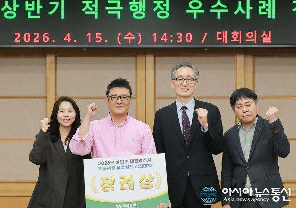 대전교통공사는 지난 15일, ‘2026년 상반기 대전시 적극행정 우수사례 경진대회’에서 우수사례로 선정되어 장려상을 수상했다.(사진의 왼쪽부터 대전교통공사 이지은 혁신성과팀 혁신담당차장, 대외사업팀 오성균과장, 유득원 대전시 행정부시장, 이명훈 대전교통공사 대외사업팀장)./사진제공=대전교통공사 .. 2026-04-18