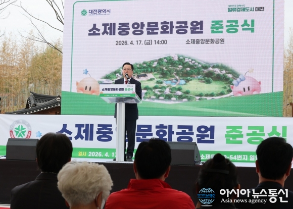 이장우 대전시장이 소제중앙문화공원 준공식에서 인사말을 하고 있다./사진제공=대전시 [아시아뉴스통신=박희석 기자] 대전시는 17일 소제동 일원에서 이장우 대전시장과 박희조 동구청장, 오관영 동구의회 의장, 지역주민 등 150여 명이 참석한 가운데 '소제중앙문화공원 조성사업' 준공식을 개최했다. .. 2026-04-18