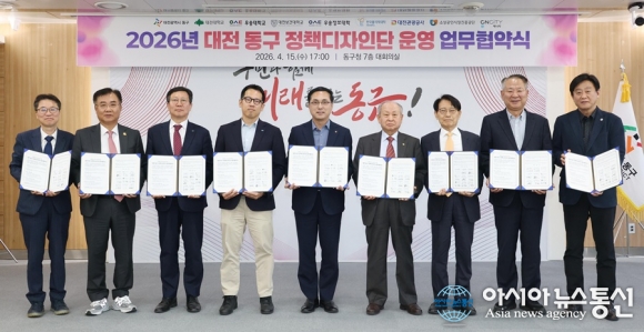 정책디자인단 운영 업무협약 체결 모습./사진제공=동구 [아시아뉴스통신=박희석 기자] 대전시 동구는 지·산·학 협력 기반의 '정책디자인단' 운영을 위해 지난 15일 지역 대학 및 관계 기관과 업무협약을 체결했다고 16일 밝혔다. 이번 협약에는 △대전대학교 △우송대학교 △대전보건대학교 △우.. 2026-04-17