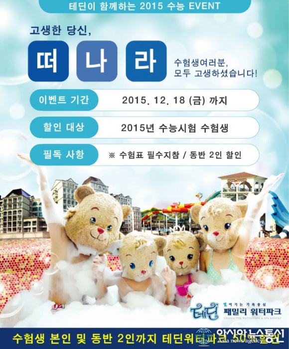 테딘패밀리워터파크가 수험생을 대상으로 특별 할인 행사를 진행한다.(사진제공=테딘패밀리리조트) 충남 천안 테딘패밀리워터파크(이하 테딘워터파크)가 수험생들을 위해 특별 할인 행사를 진행한다. 다음 달 18일까지 진행되는 이번 행사는 올해 대입수능시험을 지른 .. 2015-11-11