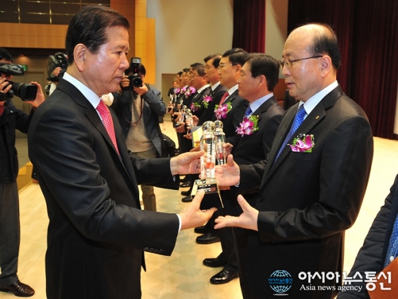 3일 조권형 농협충남본부장이 최원병 농협중앙회장으로부터 상호금융 20조 달성 매출의 탑을 수상하고 있다.(사진제공=농협충남본부) 농협중앙회 충남지역본부가 3일 농협중앙회로 부터 상호금융 예수금 20조원 달성탑을 수상했다. 상호금융 예수금 달성탑은 지역 농·.. 2015-11-03