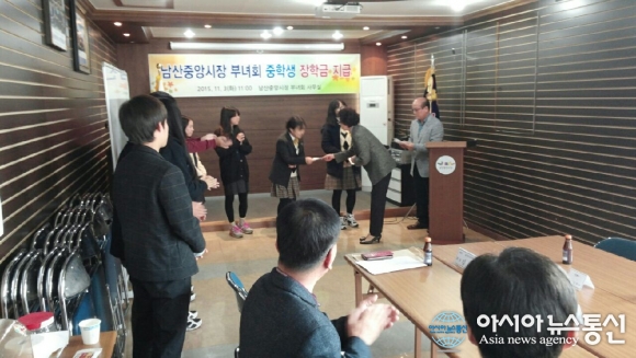 충남 천안남산중앙시장 부녀회는 3일 천안시 관내 5개 중학교 10명에게 장학금을 전달했다.(사진제공=천안시청) 충남 천안남산중앙시장 부녀회는 3일 부녀회사무실에서 천안시 관내 5개 중학교 10명에게 장학금을 전달했다. 어려운 환경 속에서도 학교생활에 모범이 되는 .. 2015-11-03