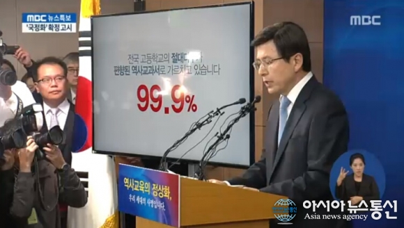 3일 오전 11시 정부서울청사에서 황 총리는 '역사교육 정상화 담화문'을 통해 국정화의 필요성을 강조했으며 역사교과서 국정화 확정 고시와 함께 "현행 검정제도로는 올바른 역사교과서를 만드는 것이 불가능하다"고 밝혔다.(사진출처=mbc방송캡처) 2015-11-03