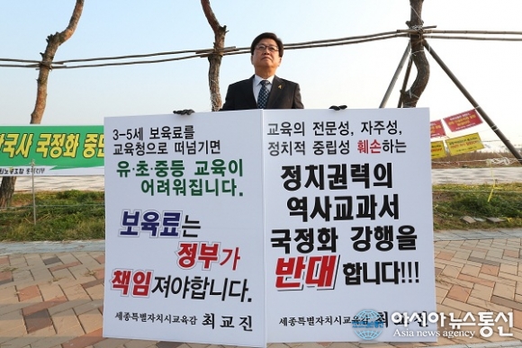 2일 최교진 세종시교육감은 오전 8시부터 한시간 동안 교육부 세종청사 앞에서 역사교과서 국정화 반대와 누리과정 예산의 정부 편성을 요구하는 피켓시위를 했다.(사진제공=세종시교육청) 최교진 세종시교육감과 장휘국 광주시교육감이 역사 교과서 국정화 추진 철회를 .. 2015-11-02