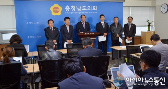 2일 충남도의회 브리핑실에서 3농혁신 정책특별위원회 위원들이 기자회견을 열고 새정치민주연합 위원들의 참여를 촉구하고 있다.(사진제공=충남도의회) 충남도의회 3농혁신 등 정책특별위원회(이하 정책특위.위원장 전낙운)가 새정치민주연합 소속 위원들의 참여를 호소.. 2015-11-02