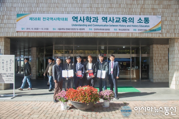 지난달 30일부터 이틀간 서울대학교에서 열린 제58회 전국역사학대회 '답사 동영상 경연대회' 서 최우수상과 장려상을 수상한 한남대 성백용 역사교육과 교수, 김형진, 한승일 역사교육과 학생, 신동원, 홍준영 사학과 학생, 이진모 사학과 교수(왼쪽부터)가 상패와 상장을 들고 기.. 2015-11-02