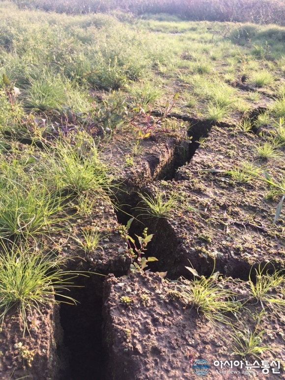42년 만의 가뭄으로 인해 충남 예산군 소재 예당저수지 상류와 하류지역이 마치 지진으로 인한 균열이 발생한 것 마냥 갈라져 있다. 우리나라 최대 규모의 저수지 예당호는 지난 1962년 예산과 당진지역에 물을 공급하기 위해 만들어 졌다./아시아뉴스통신= 최솔 기자 2015-11-02