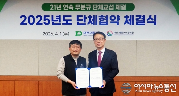 대전교통공사는 1일 본사에서 노사 대표가 참석한 가운데 단체협약을 체결하고 기념촬영을 하고 있다. /사진제공=대전교통공사 [아시아뉴스통신=박희석 기자] 대전교통공사는 1일 본사에서 노사 대표가 참석한 가운데 단체협약을 체결했다고 밝혔다. 이번 협약은 지난해 9월 단체교섭 요구를 시작으로 약 6개월.. 2026-04-01