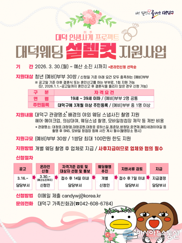 ‘대덕웨딩 설렘컷 지원사업’ 안내 포스터./사진제공=대덕구 [아시아뉴스통신=박희석 기자] 대전 대덕구는 청년 (예비)부부의 결혼 초기 경제적 부담을 완화하고 지역 정착을 유도하기 위해 ‘대덕 웨딩 설렘컷 지원사업’을 추진한다. 대덕구는 총 30쌍을 선정해 1쌍당 최대 100만원 한도 내에서 웨.. 2026-03-29