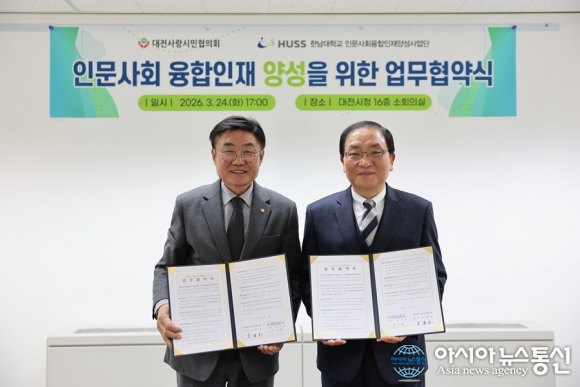 한남대 HUSS사업단-대전사랑시민협의회 업무협약 모습./사진제공=한남대 [아시아뉴스통신=박희석 기자]한남대학교 인문사회융합인재양성사업단(이하 HUSS 사업단)이 대전사랑시민협의회와 인문사회 융합인재 양성을 위해 머리를 맞댄다. 지난 24일 오후5시 대전시청 16층 소회의실에서 업무협약식이 열렸으며, .. 2026-03-26
