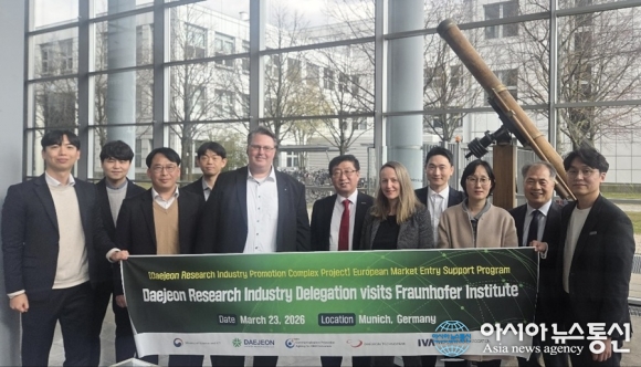 한국연구산업협회 박한오 회장 등 대전TP대표단이 프라운호퍼연구소를 방문 후 기념촬영을 하고 있다. /사진제공=대전테크노파크 [아시아뉴스통신=박희석 기자] 대전테크노파크(대전TP)가 세계적인 연구기관인 독일 프라운호퍼 연구소와 손잡고 대전 지역 연구산업의 글로벌 영토 확장에 나섰다. 대전TP는 지난.. 2026-03-24