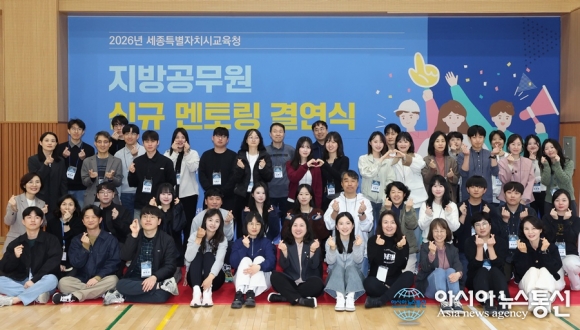 세종시교육청은 24일 남세종종합청소년센터 다목적 체육관에서 ‘2026년 지방공무원 신규 멘토링 결연식’을 개최 후 기념촬영을 하고 있다./사진제공=세종교육청 [아시아뉴스통신=박희석 기자] 세종시교육청은 24일 남세종종합청소년센터 다목적 체육관에서 ‘2026년 지방공무원 신규 멘토링 결연식&rsquo.. 2026-03-24