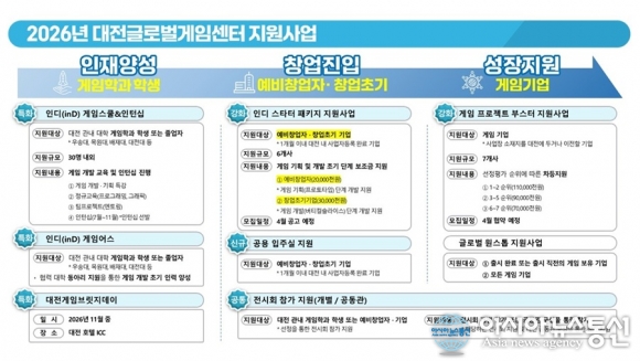 ‘2026년 인디 스타터 패키지 지원사업’의 참여기업 모집./사진제공=대전정보문화산업진흥원 [아시아뉴스통신=박희석 기자] 대전시와 대전정보문화산업진흥원(이하 진흥원)은 오는 27일까지 예비창업자부터 창업기업까지 단계별 맞춤 지원을 통해 지역 인디게임 창업 생태계를 강화하기 위한 ‘2026년 .. 2026-04-20
